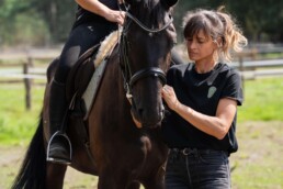 Diplômée de l'IF3E et du D.U. Ethologie du cheval, sa philosophie est axée sur le bien-être / mieux-être en respectant l'intégrité su cheval et de son cavalier.